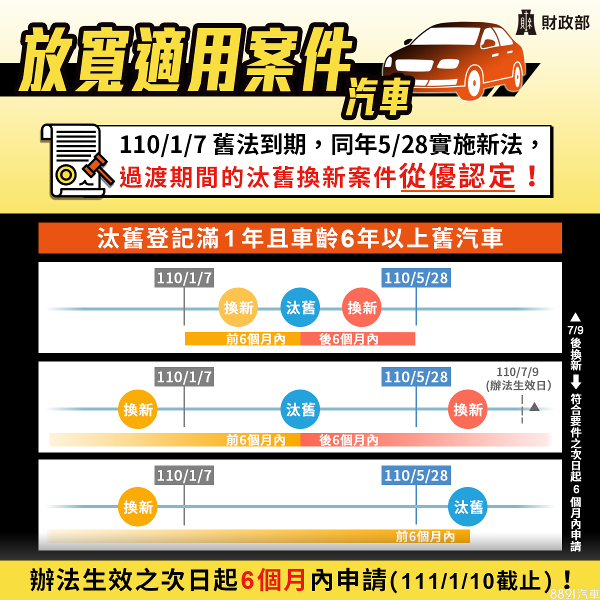 較特別的情況是,針對原本即有換購計劃的民眾,若在舊制施行期間已先行購置新車,而舊車待新制上路後才完成報廢或出口,若汰舊程序在新車領牌日的半年內,亦仍適用舊制的核審標準。不過,上述因應空窗期而產生的特殊狀況,須於2022/1/10前完成申請,距今僅剩約2個月的時間,如適用舊制者務必把握!
