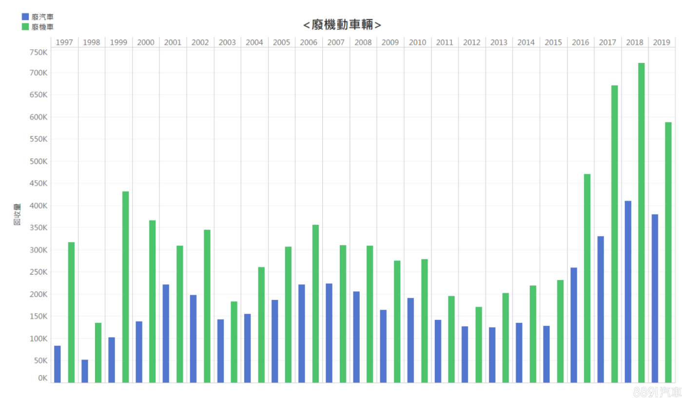 舊換新政策推行這麼久了,成效又如何?根據環保署1997~2019年的統計資料,不論汽車或機車,其回收數量皆在2018年達到23年間的最高峰,且汽、機車回收量最高的前四年份,均落在開始實施舊換新退稅的2016年後。