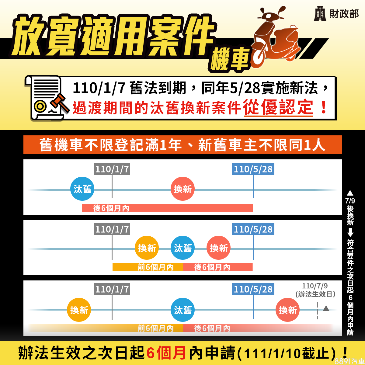 機車部分,同樣須在6個月內報廢或出口舊車及完成新車領牌,亦不限先後順序,而對於「舊車」的認定亦維持過往的「4年」,不過修法後取消舊制中對舊車車主登記滿1年的要求,也不再限制新車車主的身分資格。