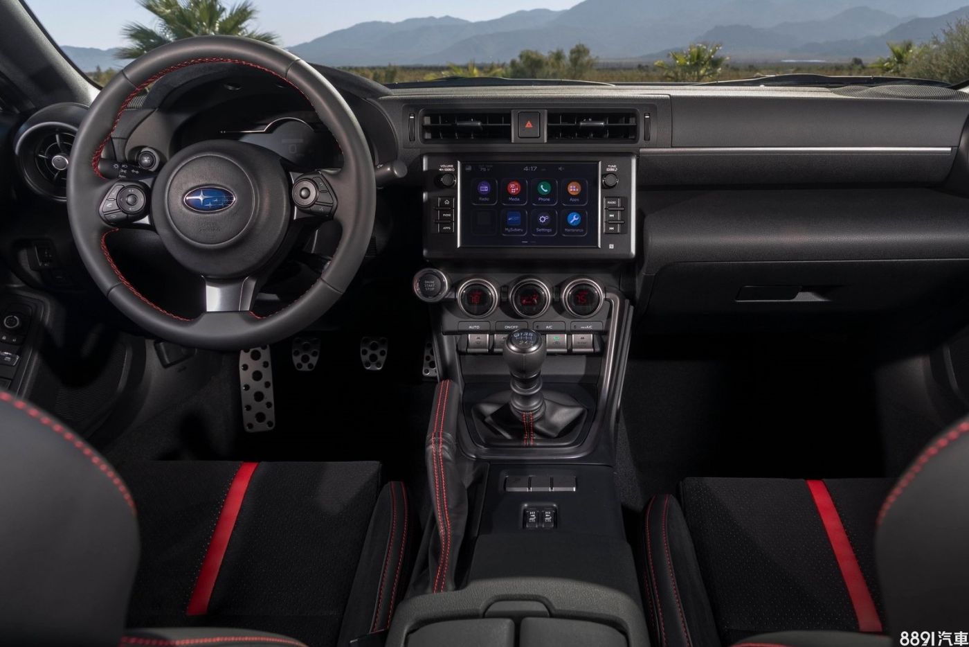 新BRZ內裝運用水平線條,搭配按鍵的精簡化,讓車室內看來更加簡約,包含7吋數位儀錶、8吋多媒體觸控螢幕均列為標配,可支援Apple Carplay與Android Auto連接。