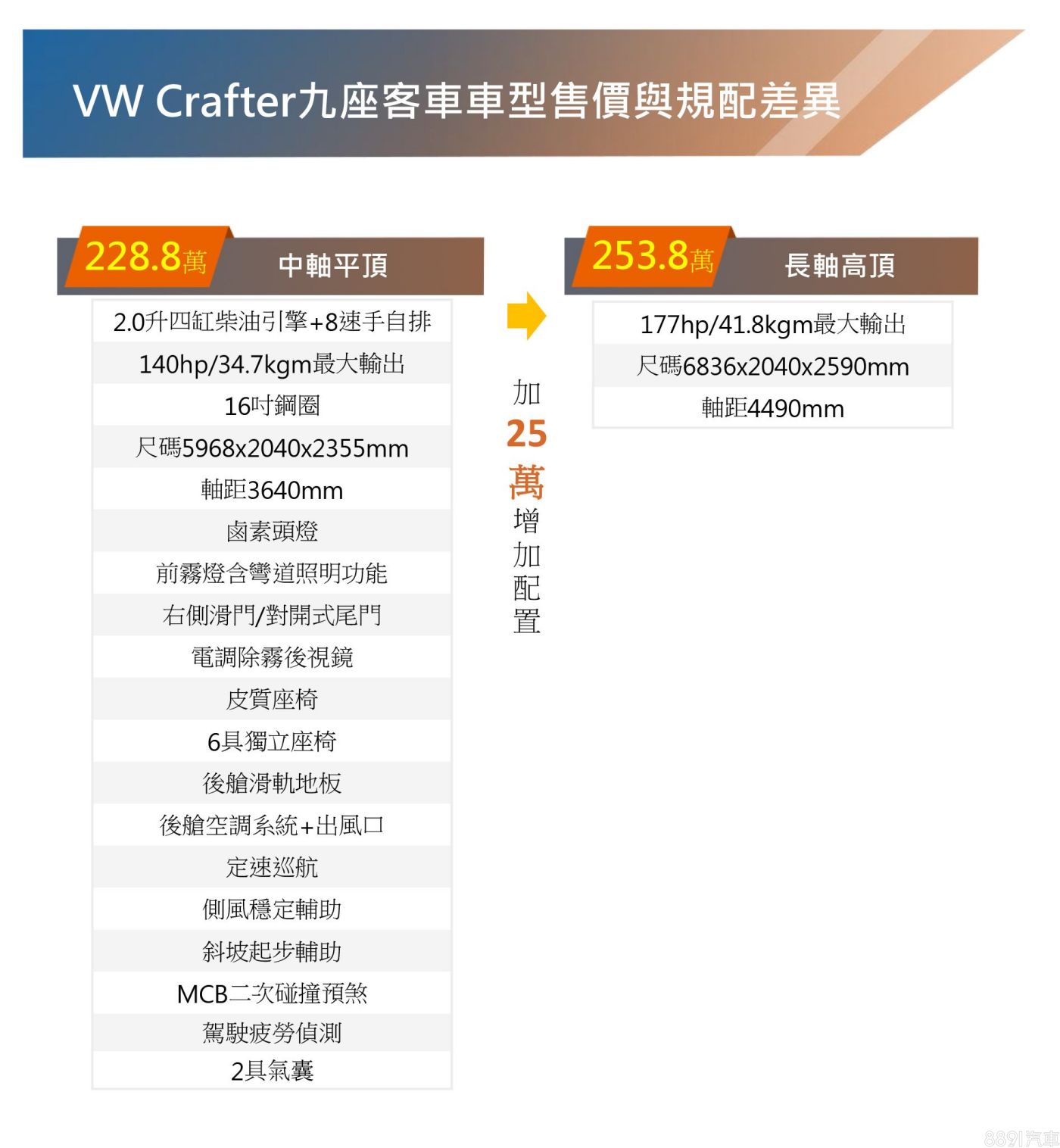 與先前導入的Crafter Van不同,Crafter九人座客車改搭兩側大面積固定式車窗,中軸平頂和長軸高頂車型軸距分別為3640、4490mm,後者即便身高一米九的成年男子,在車艙中也能抬頭挺胸地活動。