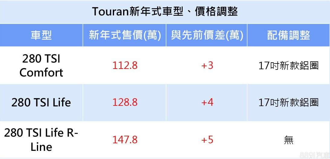 Touran 2022年式同樣在編成方面沒有改變,依車型不同有著3~5萬元之漲幅,並將入門及二階版本標配的17吋鋁圈,換上新造型,其餘配備無調整。
