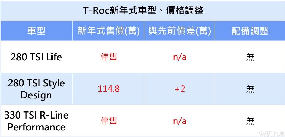 至於2022年式T-Roc,由於正值國外甫發表小改款的青黃不接之際,改提供單一280 TSI Style Design車型,開價114.8萬元,較先前略漲2萬,配備方面並無調整。