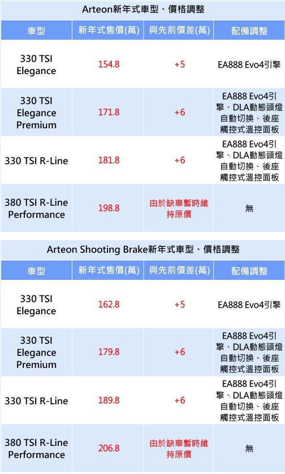 2022年式Arteon/Arteon Shooting Brake車系在各自維持既有編成的前提下,依車型不同有著5至6萬元之漲幅,不過原先代號為EA888 Evo3的2.0升四缸渦輪汽油引擎,全數升級為Evo4,另針對高階車型,也增配DLA動態頭燈自動切換、後座觸控式溫控面板,至於頂規的380 TSI車型,目前售價未有更動,主因是由於缺車。