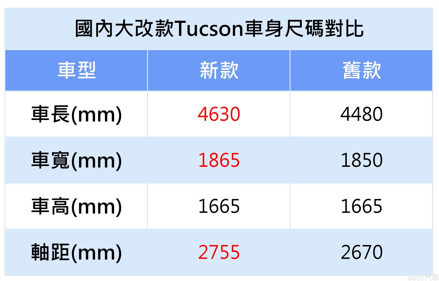 有別於舊款都以短軸版為販售車型,此次國產化Tucson比照韓國、北美等市場導入長軸版,所以原廠將其名為「Tucson L」作為區別,新車以第三代N-Platform平台打造,車身尺碼較前代略有放大,相比國內販售舊款,軸距增加85mm之多。
