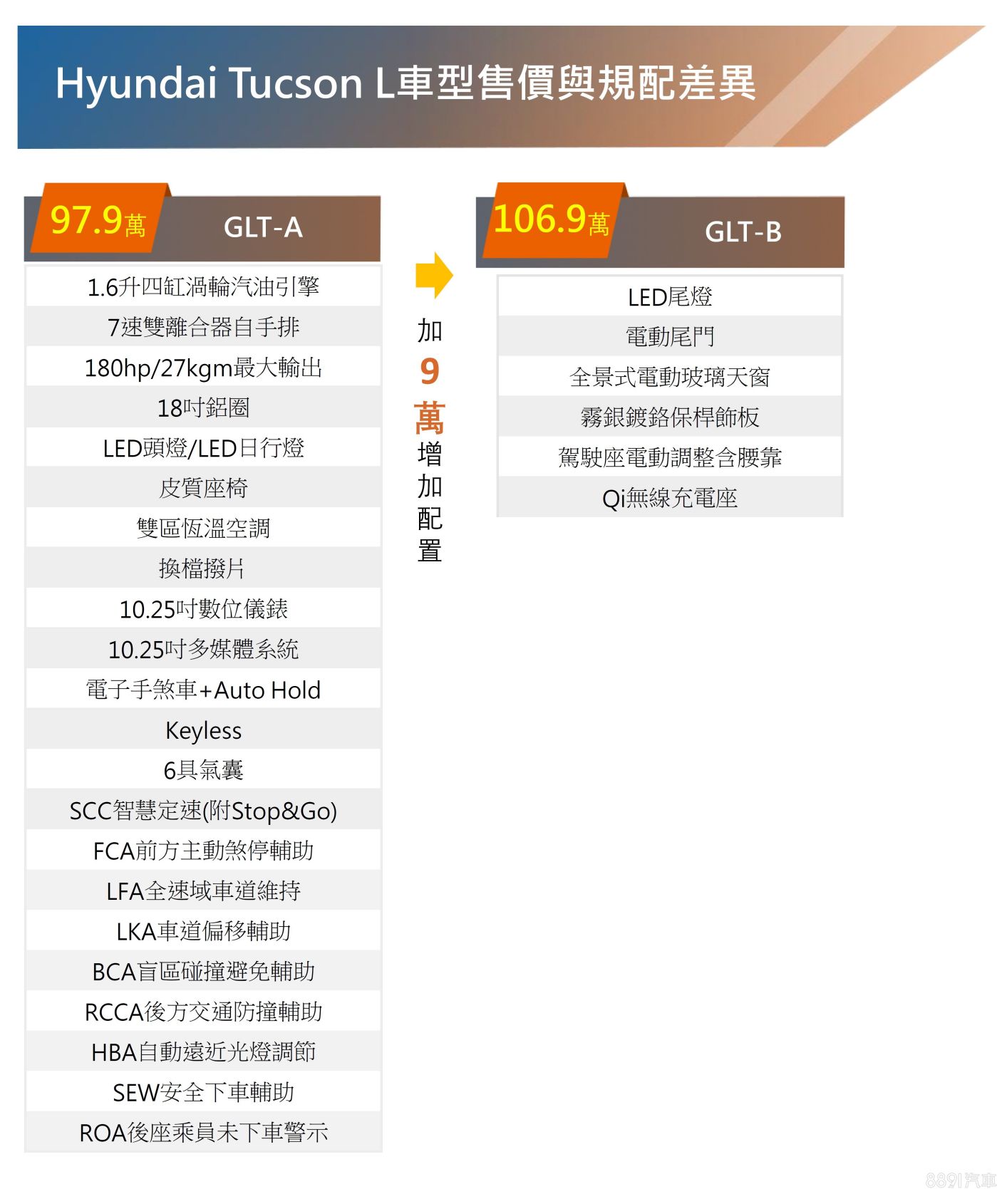 大改款Tucson維持國產及客貨車認證,規劃單一1.6升渦輪動力、雙車型可選,GLT-A與GLT-B分別開價97.9、106.9萬元,較接單價再降2萬元,而原廠亦表示近2個月的預售階段,已累積破一千張訂單,即日起開始交車。
