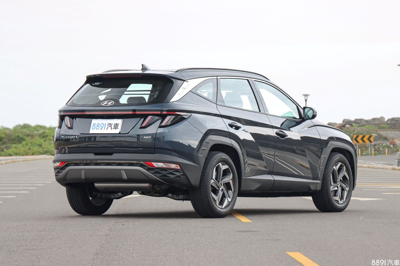豐富的車身鈑件線條、上揚腰線的跑旅造型、從D柱向前延伸的銀色飾條、如同獠牙般的橫貫式尾燈等等,吸睛能力絲毫不輸車頭,而車尾銘牌也改搭「Tucson L」。