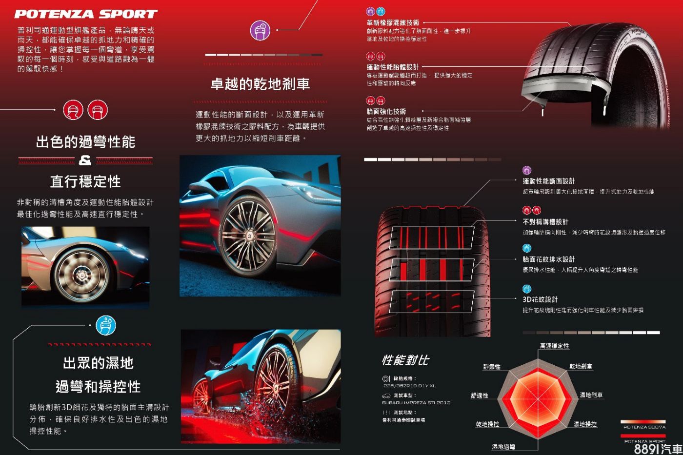 日本輪胎品牌普利司通,在台推出Potenza系列的性能產品「Potenza Sport」,宣稱新胎特別針對抓地表現做強化,以增進乾、濕路面的操控表現。