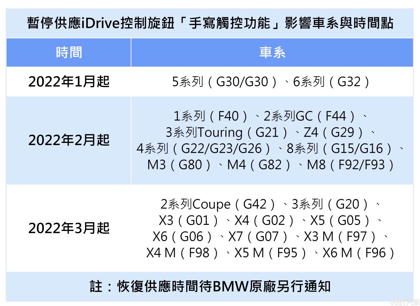 車用晶片荒持續延燒,BMW總代理汎德接獲德國原廠通知,最快自2022年1月起生產之新車,暫停供應iDrive控制旋鈕「手寫觸控功能」,且受影響車輛將不提供補償或調整建議售價。