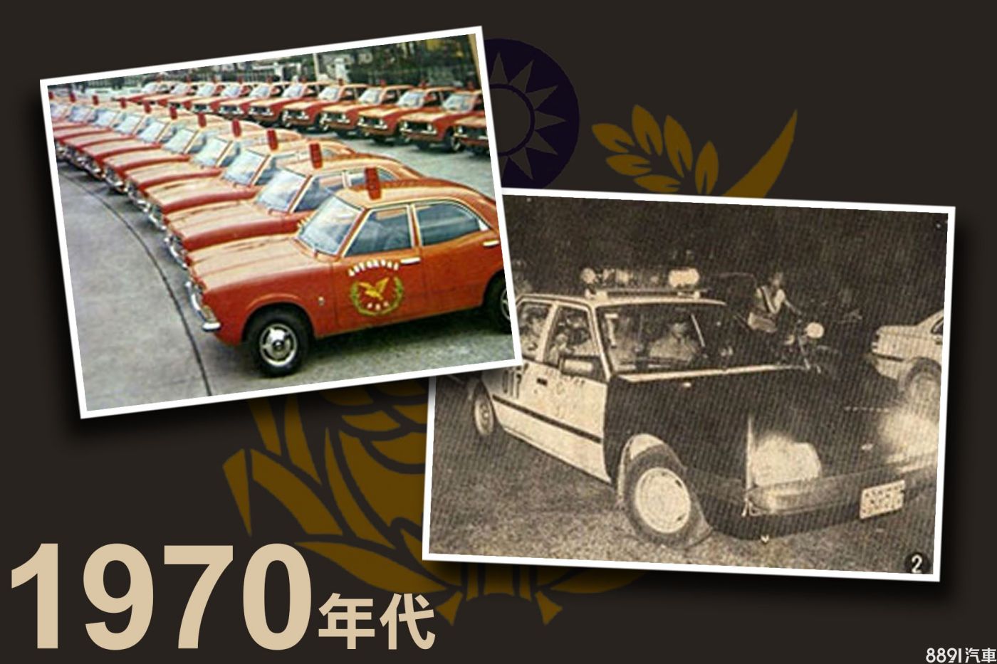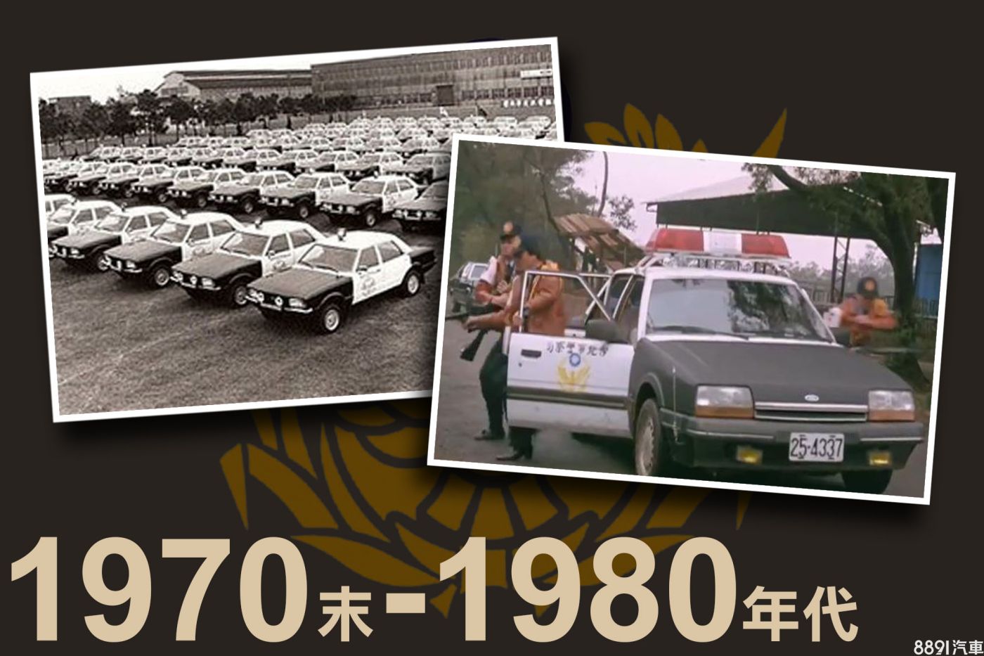 1970年代末期到1980年代,隨著台灣經濟的高速發展,吸引許多包含日產、三菱、福特等外國汽車品牌到台灣建立工廠,自此台灣正式開始有本地生產的國產車,具有價格優勢的國產車毫無意外的成為當時台灣警方的主力巡邏車。美系福特更是因為當時親美的外交政策備受親賴,如上圖左側70年代的福特跑天下(Cortina)、與右側80年代的福特天王星(Telstar)都是當時警車的經典,而在圖中也可以看的出來,這時候警車已漸漸的將車頂上的警示燈,由原來的單顆圓柱體改為大家比較熟悉的雙顆對稱式旋轉排燈。(圖片出處:內政部警政署、警政文庫)