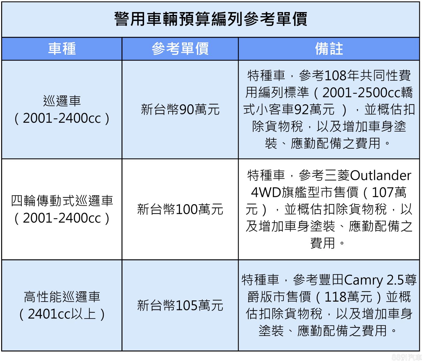 最後附上一張目前的「警用巡邏車預算編列參考單價表」給各位,可以看到警方在編列預算時還是會適時參考現有市售車的售價,主要是因為現在的車價跟以往已經不可同日而語,若是繼續沿用以前的預算來採購,還真的是會買不太到適合的車款。因應日漸進步的汽車科技,警車當然也要有所升級,日漸多元的警車編制也可以讓警方值勤時更加得心應手,安全方面也可以獲得大幅保障。(資料來源:內政部警政署)