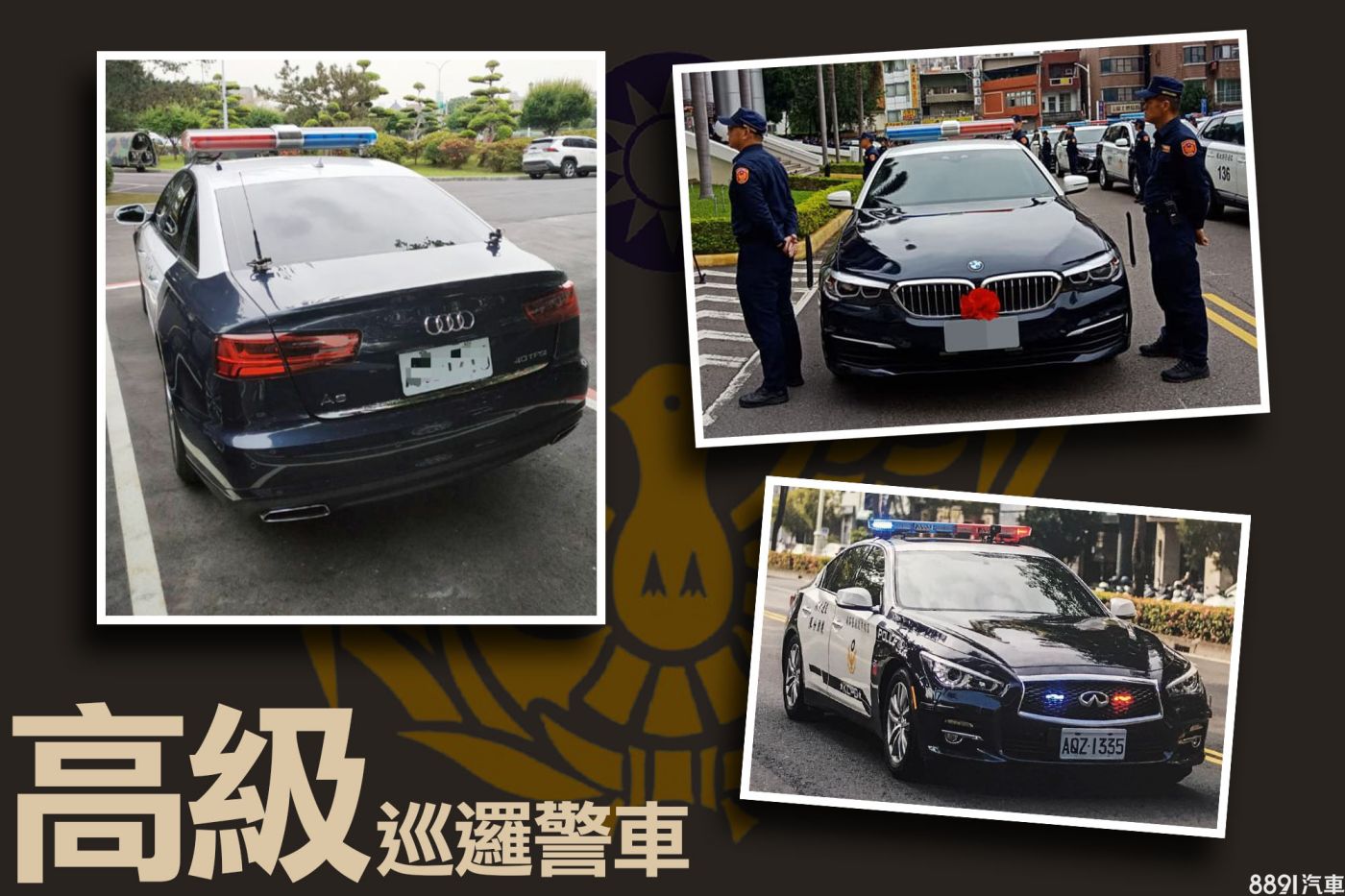 各局處也可以依照轄區需求,特別編列預算購買豪華進口車作為警車使用,如Audi A6(圖左上)、BMW 530i(圖右上)、Infiniti Q50(圖右下)等都曾被民眾捕獲到披上警車塗裝的身影,但這些車通常是當作禮賓前導車使用居多,不太會拿來日常巡邏。(圖片出處:桃園市政府警察局、內政部警政署、警政文庫)
