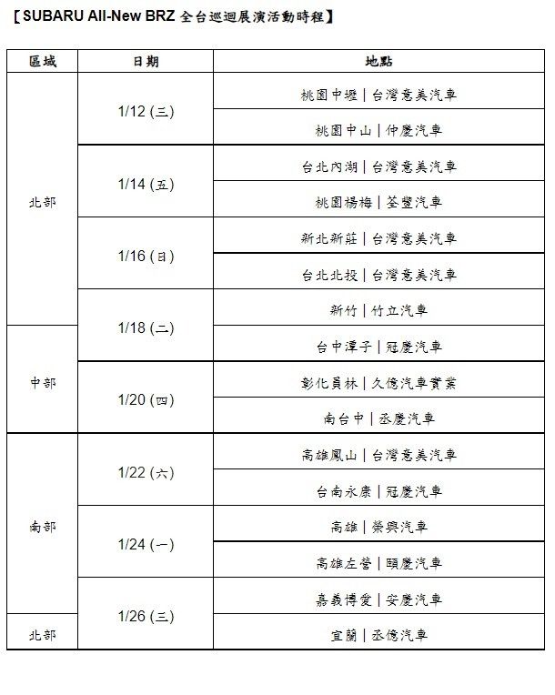 提供手排與自排版2車型、接單價各為149.8與153.8萬的Subaru大改款BRZ,將於2022年1/12起,於全台展示中心,開啟巡迴預賞,共16個場次,據業務端消息,新車正式上市約莫會在3月。
