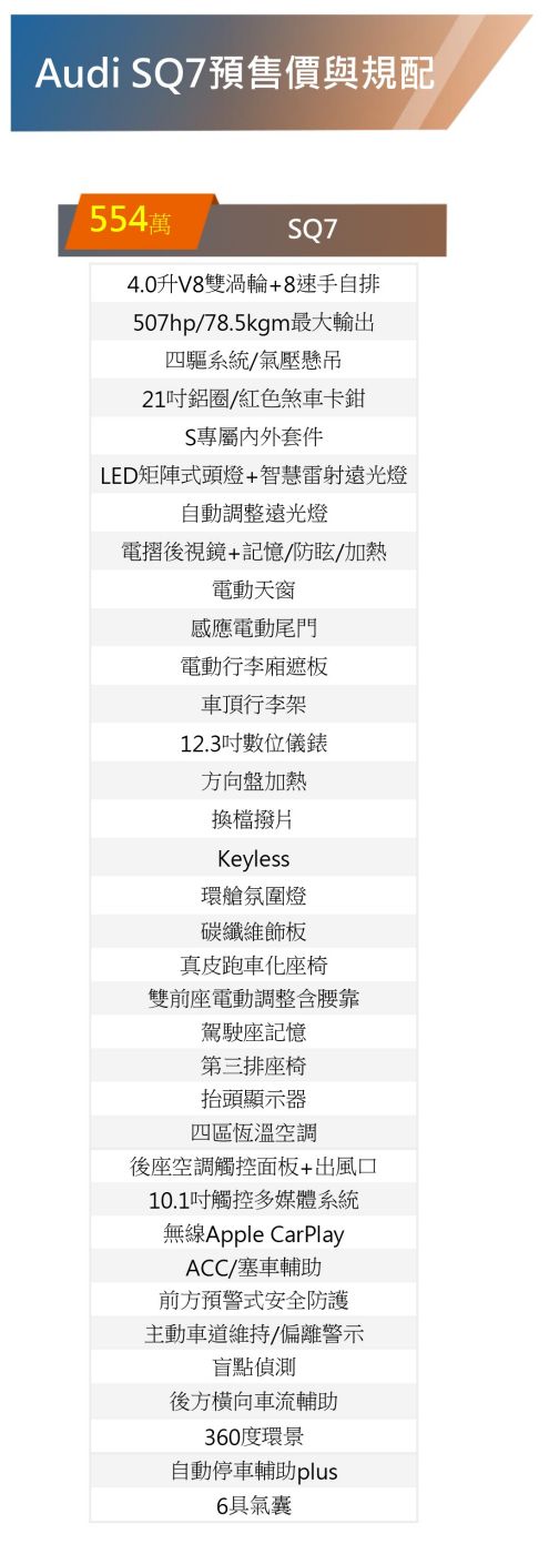 小改款Audi SQ7改搭載4.0升V8雙渦輪汽油引擎,以及8速Tiptronic手自排變速箱、quattro四驅系統,最大輸出507hp/78.5kgm,並標配低速時後輪可往前輪反方向轉動最多5度、高速(60km/h)下車輪則朝同一方向轉向、提升行駛動態與車輛穩定性的動態全輪轉向系統,以及主動式氣壓懸吊,可選多種模式的Audi drive select可程式車身動態系統等。