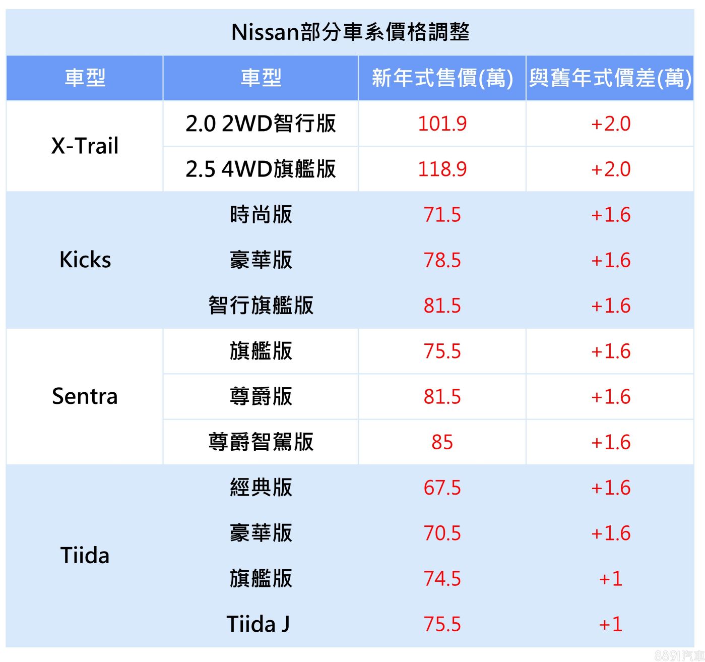 如上表所示,Kicks與Sentra均維持3車型設定,兩者均調漲1.6萬,Tiida依車型有著調高1萬至1.6萬不等,而X-Trail則統一漲2萬,漲幅為四車系最多。