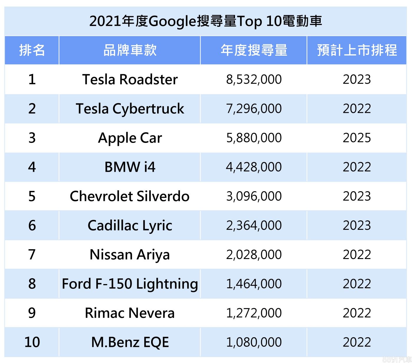 有趣的是,Tesla這兩款車至今仍未有「量產版」現身,Roadster自發表至今已過去4年,而Cybertruck也拖了2年的台錢,但即便如此消費者也沒失去耐心,從2021年度搜尋量來看,熱度仍高居不下。