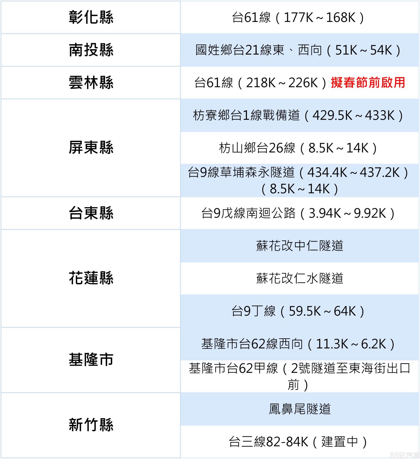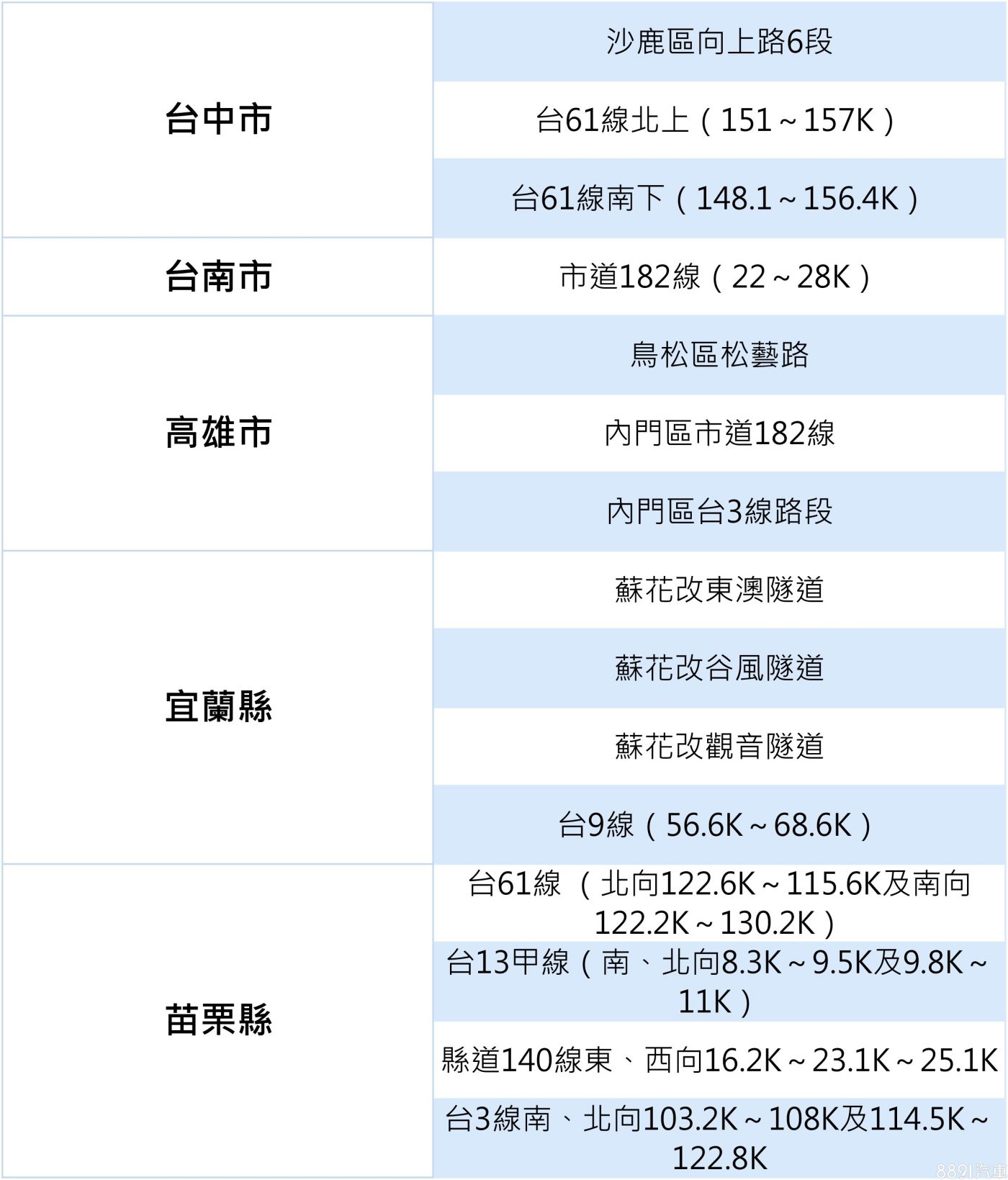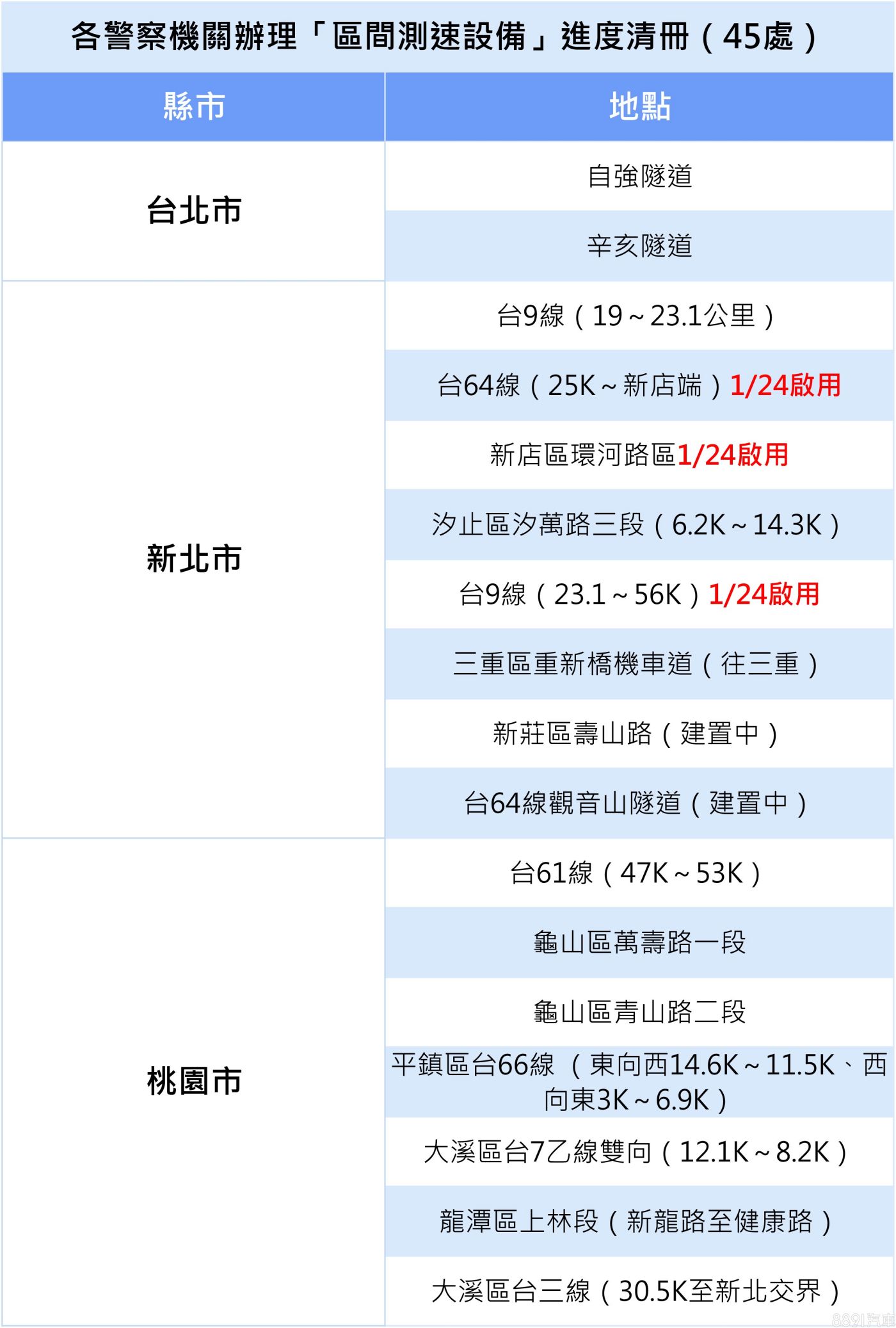 另外雲林縣政府也公布台61線218K~226K路段區間測速已完成驗證,擬在春節前啟用,各位車友們再多注意以上路段了!目前全台45處區間測速分布位置,可以參考下方表格: