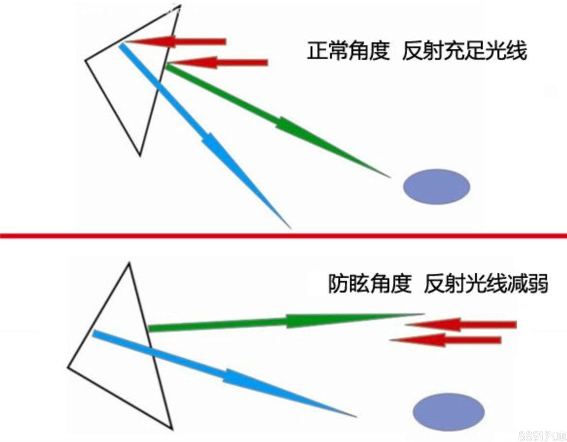「手動防眩」功能的原理其實是通過轉換鏡片構造來實現的,這種後視鏡裡具有兩個不同反射率的鏡片,分別以不同角度前後安裝。當我們通過外部撥桿調整兩個不同反射率的鏡片時,向上撥就是使用一般的高反射率鏡面,適合一般日常情況使用;而當車輛受到後方強光照射時,只要駕駛將撥桿往下扳就能改使用低反射率的鏡面,這組鏡面可以將光線強度減弱,而原本的高反射率鏡片則會被移到後視鏡上方,如此一來駕駛的眼睛就能避開強光直射防止視線受到影響。