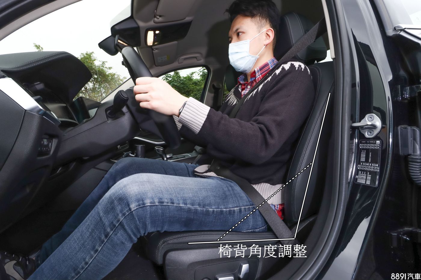 椅背角度必須配合視線來調整,駕駛可以先將椅背放倒一些,讓身體暫時離開椅背,接著找到雙眼可平視前方,身體也能自然放鬆的角度,再把椅背往前貼合,貼合準則就是背部、頭部都有支撐到即可。