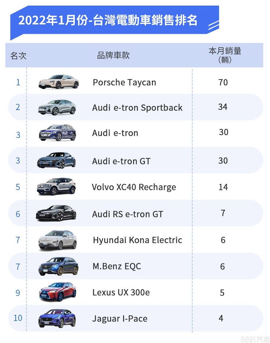 在台上市後就在電動市場表現強勢的保時捷Taycan,少了特斯拉阻撓,順利拿下單月電動冠軍;至於跨界版的Taycan Cross Turismo,已於去年底在台發表,1月共計3輛掛牌,未來穩定交車後,估計也會是上榜常客。