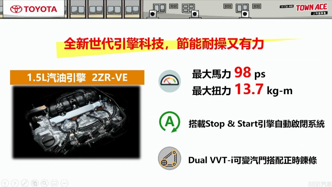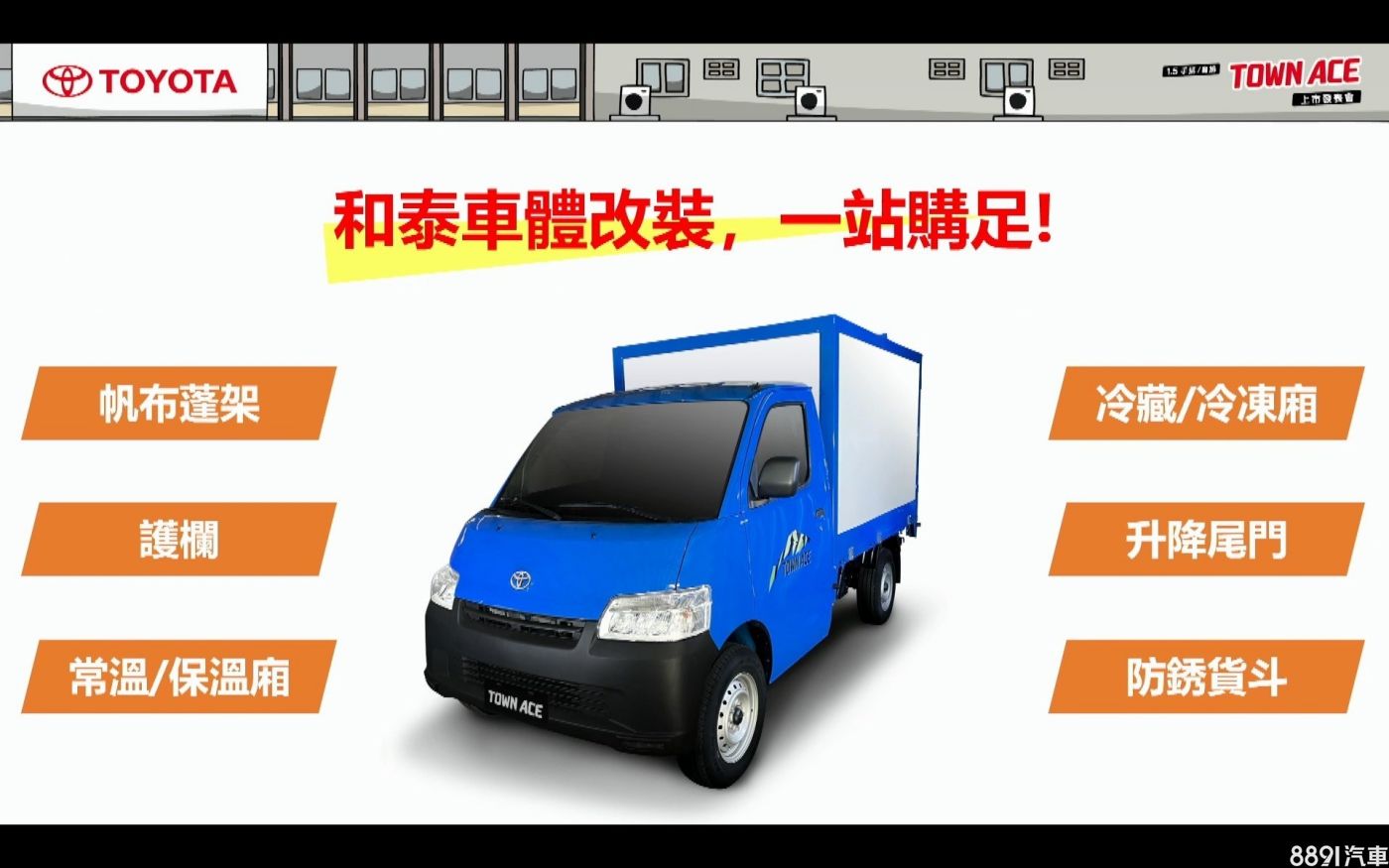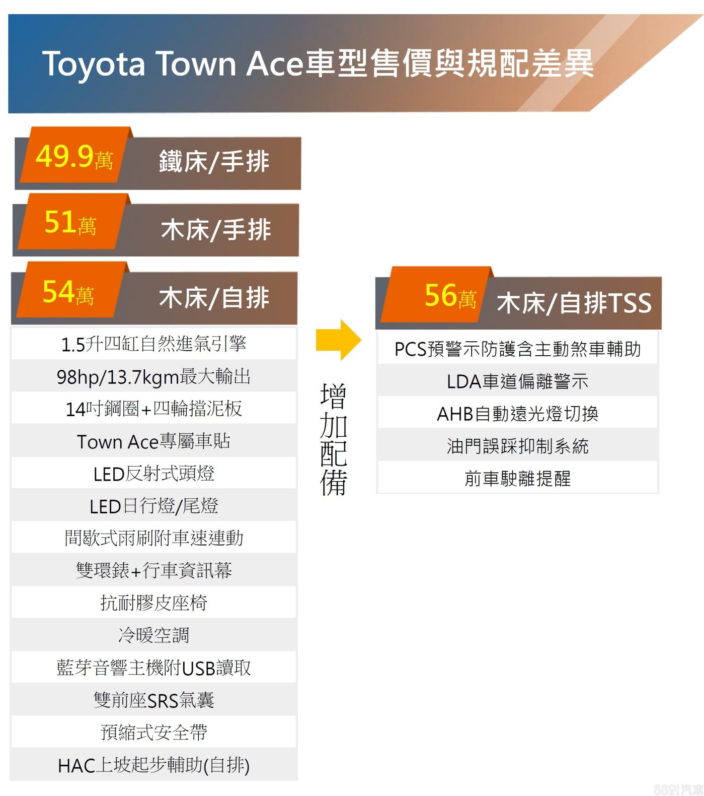 Town Ace目前僅供應貨車,並劃分鐵床手排、木床手排、木床自排及木床自排TSS等四款車型,正式售價依序為49.9萬、51萬、54萬、56萬,較預售價降1萬元,全車享4年12萬公里、貨斗2年5萬公里保固,和泰設定年販目標1萬台,另外按先前公布的年度新車計畫,廂車版本Town Ace Van預計第四季導入。