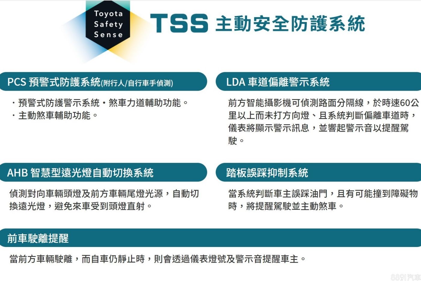 TSS駕駛輔助系統為頂規版本獨享,包含PCS預警示防護系統含主動煞車輔助、LDA車道偏離警示、AHB自動遠光燈切換、油門誤踩抑制及前車駛離提醒等機能。