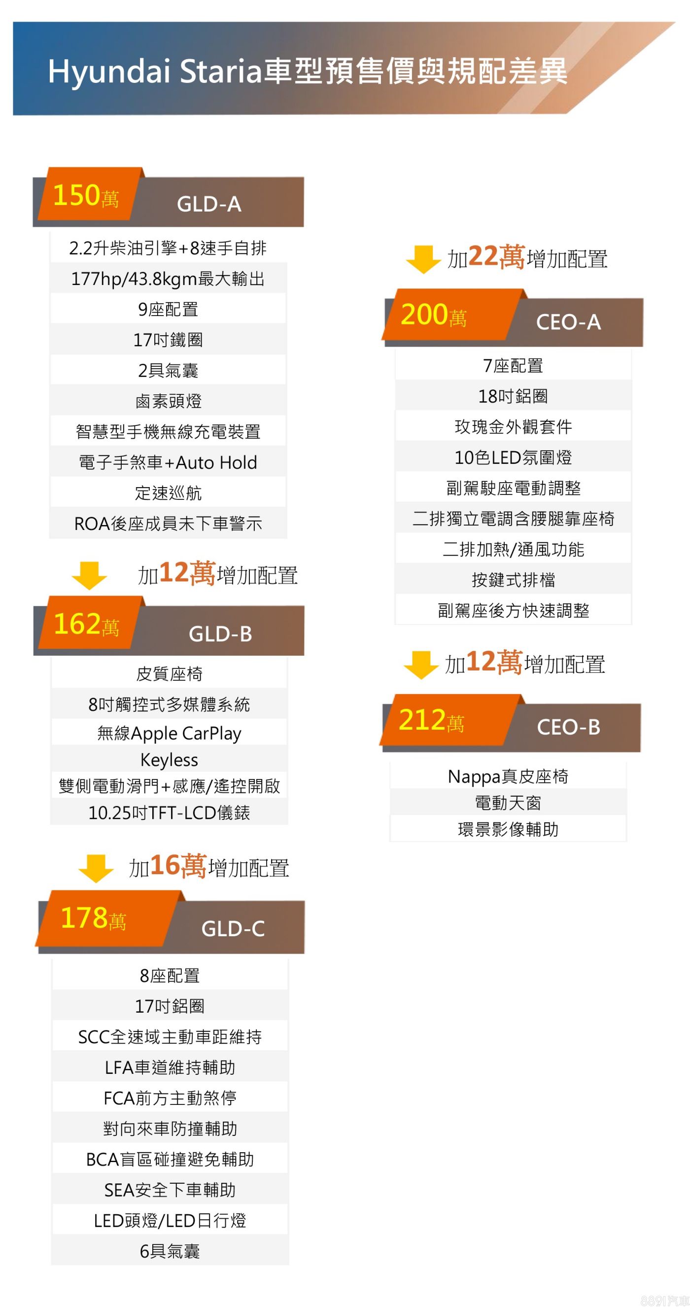 國內導入的Staria車系,國內提供7、8、9人座配置,多達5車型,預售價150萬元起,詳細編成與重點規配如附表。