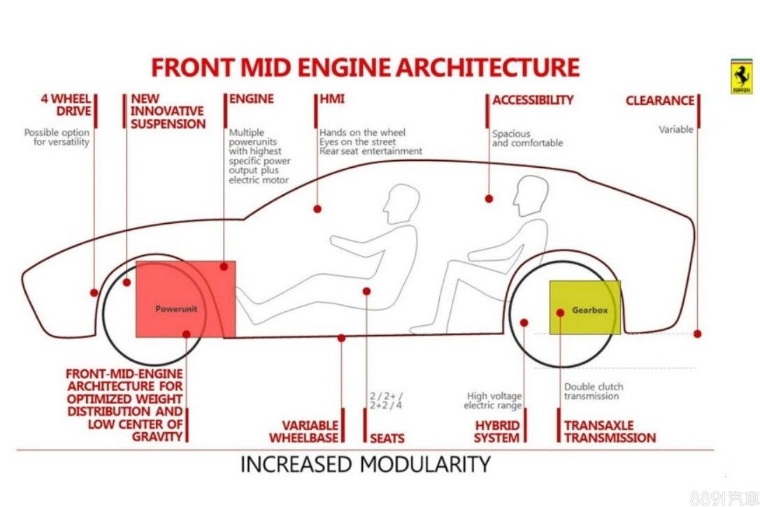 目前較明確的資訊是,這款名為Purosangue的運動型多功能車,將以Front Mid Engine Architecture平台打造,尺碼會趨近於自家的GTC4 Lusso。至於動力,主流猜測為比照296 GTB上、以3.0升V6雙渦輪汽油引擎為主的Hybrid系統,也有一說是比照SF90、採用以4.0升V8雙渦輪汽油引擎為主的PHEV架構。