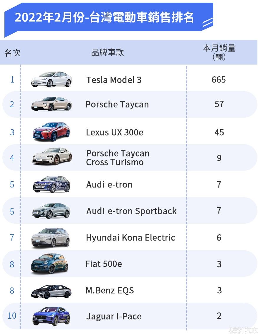 受到大環境缺車影響,加上2月適逢農曆春節,工作天數少,台灣總市場較前月衰退41.2%。然而電動車市場卻逆勢攀升,幕後功臣不外乎Model 3,延續「每到港就霸榜」的慣例,2月交付665輛,占電動市場約82.3%,也成功帶特斯拉擠身台灣當月十大暢銷車廠。