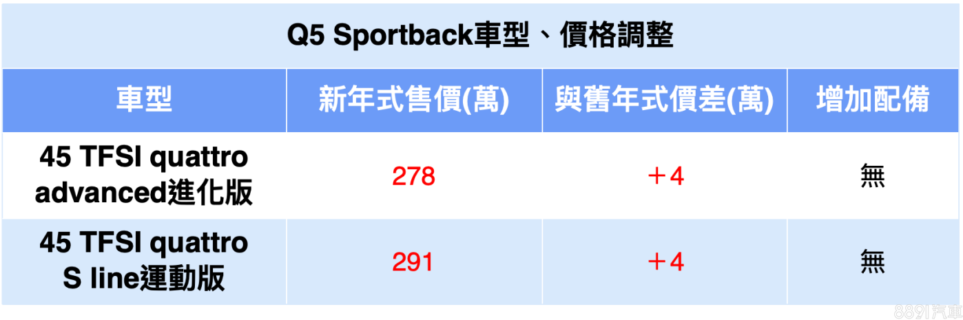 近日奧迪官網在Q5 Sportback的規配表中進行了更新,自2022年第1週起生產的車型將調漲售價4萬元,依序來到278萬、291萬,不過兩款車型的配備皆沒有變動,兄弟車Q5目前則尚未有調整售價的消息。