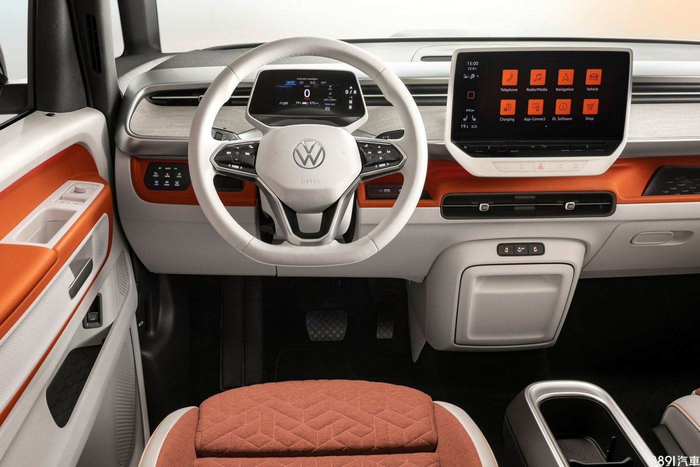 內裝延續概念車的簡約風格,採用水平分層的線條設計,雖然原廠尚未公布各版本配備差異,不過如圖所示,ID. Buzz將會搭載一具大小適中的數位儀錶,搭配中控台聳立的觸控螢幕,並大量取消實體按鍵,視覺上十分清爽,雙A柱的獨特設計也讓前方視野更顯出色。