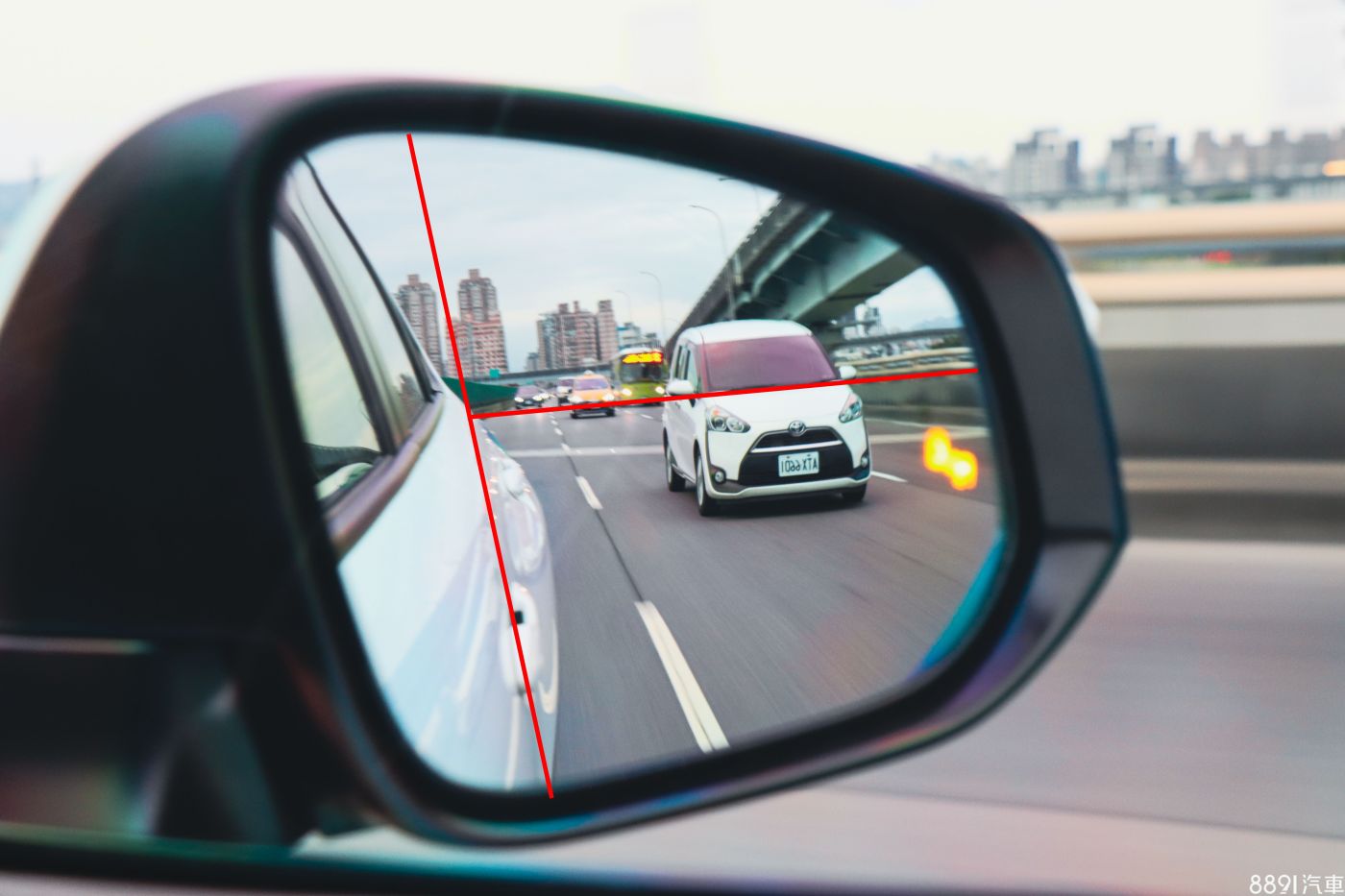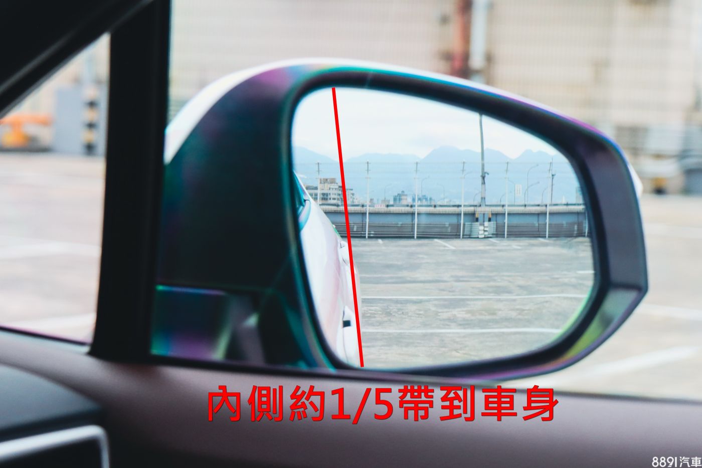 接著調整鏡片左右,從駕駛視野看去最好能在鏡片內側帶到約1/5的車身,有了車身做為參考,便能快速掌握後方車輛與自身的橫向距離,一眼就能看出後方車輛相對位置。