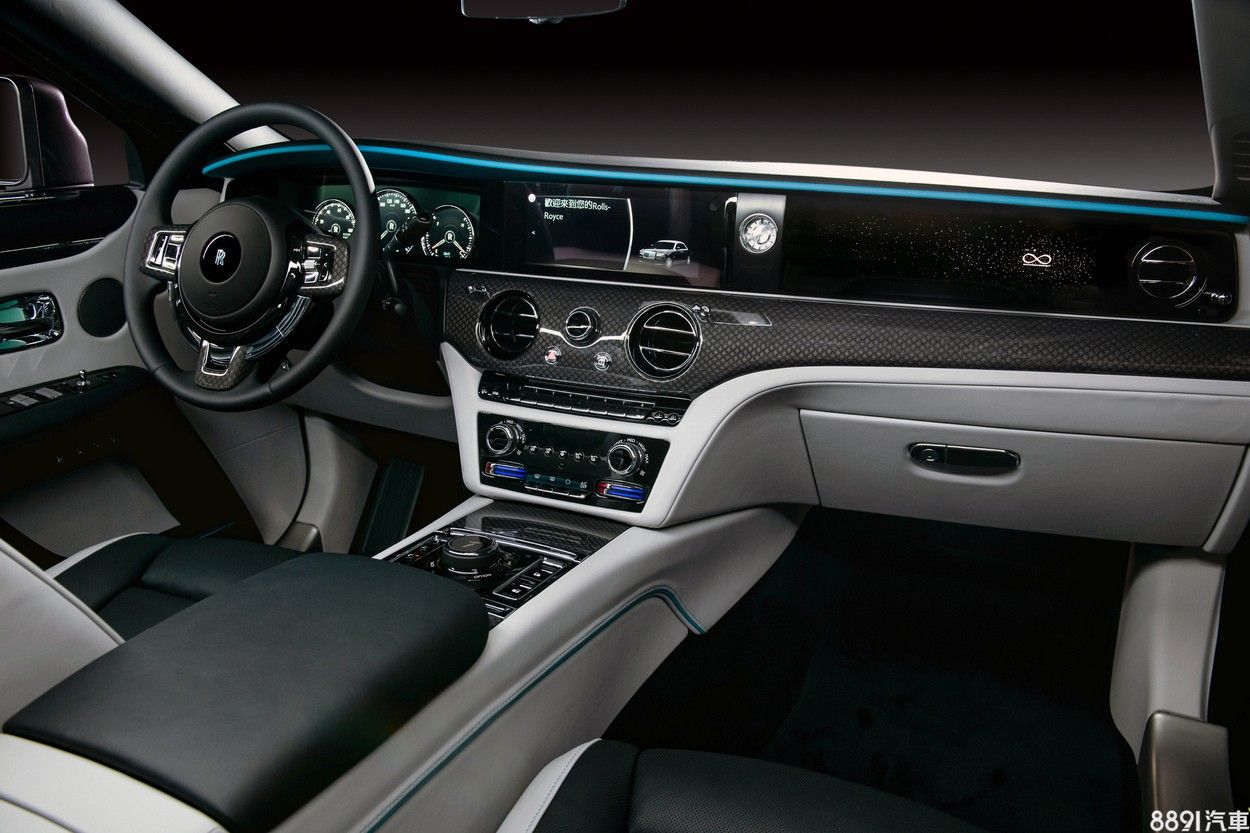 進入車內,Black Badge Ghost延續「黑化」的元素,於中控台、方向盤、排檔座用上由碳纖維和金屬纖維製成的科技纖維層,搭配多層實木飾板。原廠提到為保證飾面光滑平整,所有部件需經過一小時的100度高溫處理,再進行噴砂,預處理過後進行六層噴漆,手工打磨拋光後再進行組裝。