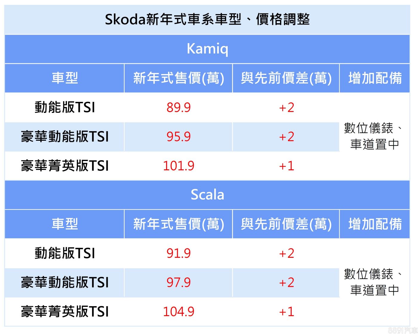 新年式Kamiq與Scala,主要變動在於全車系將10.25吋全螢幕數位儀錶列為標配,同時車道輔助系統也補上車道置中功能,雖然售價也依車型調漲1~2萬不等,但配備價值完全有到位。