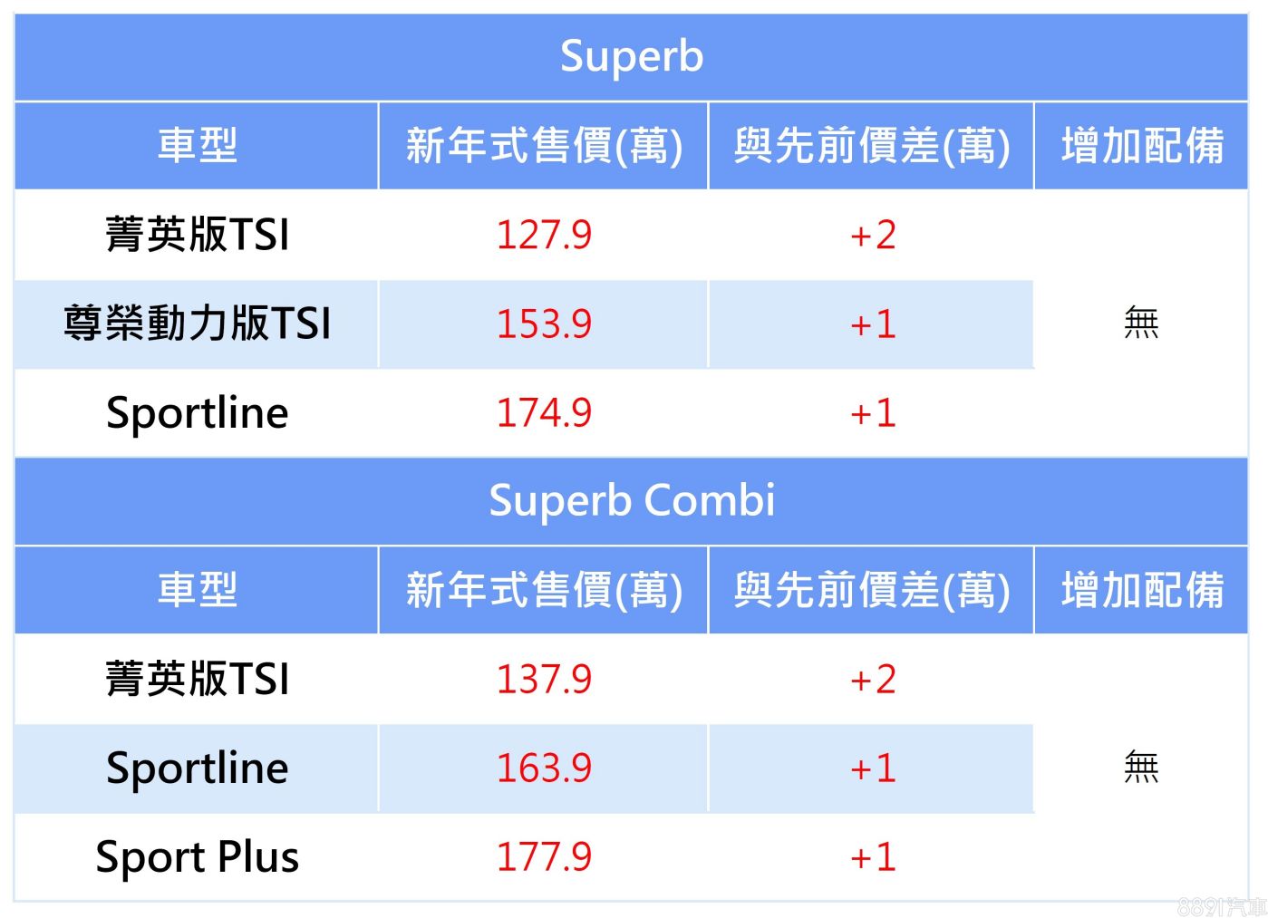 新年式Superb配備方面並沒有更動,主要是因為反應成本而調漲,房車與旅行車編成不變,各有1~2萬不等漲幅。