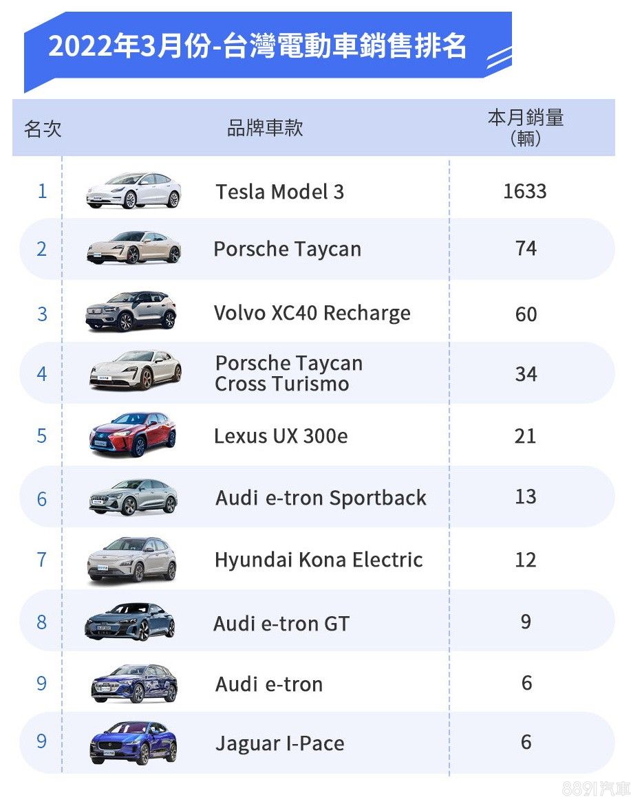2022年3月份共有39442輛新車掛牌,其中有1881輛是電動車,市場佔比約4.76%,比起2月的808輛單月成績,有著232.7%的成長幅度,同時也是近一年最高的電動車掛牌數,打破2021年11月1354輛的紀錄。