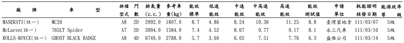 有別於上述NEDC測試標準,部分送測車款以WLTC標準來進行測試,包含Maserati MC20、McLaren 765LT Spider及Rolls-Royce Ghost Black Badge,平均能耗分別為8.8km/L、8.1km/L及6.3km/L,能源效率等級皆為5級。