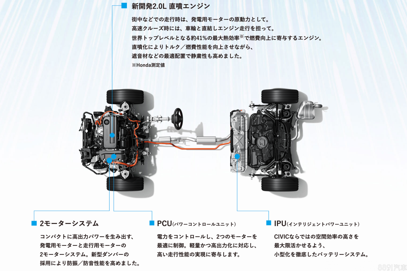 日規Civic e:HEV同樣採用2.0升四缸阿金森循環引擎,搭配前軸兩具電動馬達、鋰電池組構成油電系統,原廠稱引擎熱效率可達41%,綜效最大輸出181hp/32.1kgm,且是「以電為主、以油為輔」的作動型式。