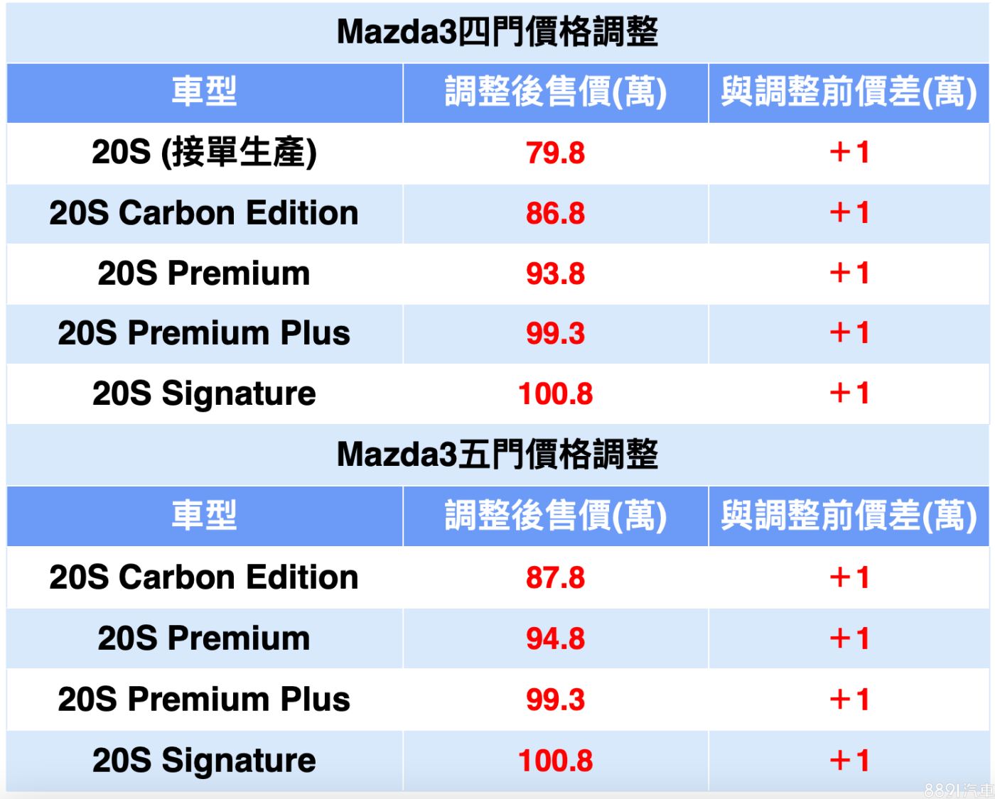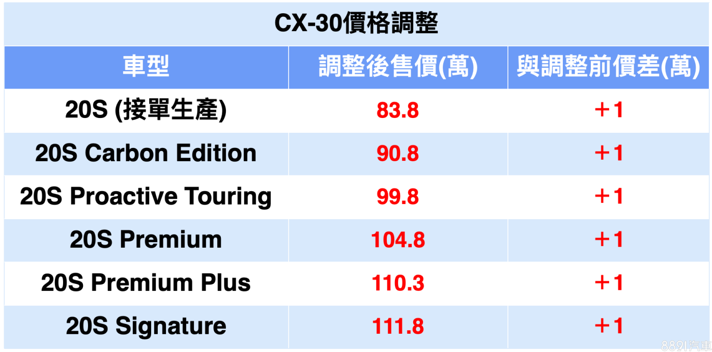 以上更新的售價自4月15日起開始實施,4月14日前下訂的準車主仍適用原有價格,對比有些進口品牌調漲2~3%不等的售價,Mazda3與CX-30目前僅調漲1萬,算是較「手下留情」,不過在大環境未好轉的狀況下,預估未來仍持續會有品牌進行售價或配備的更動。