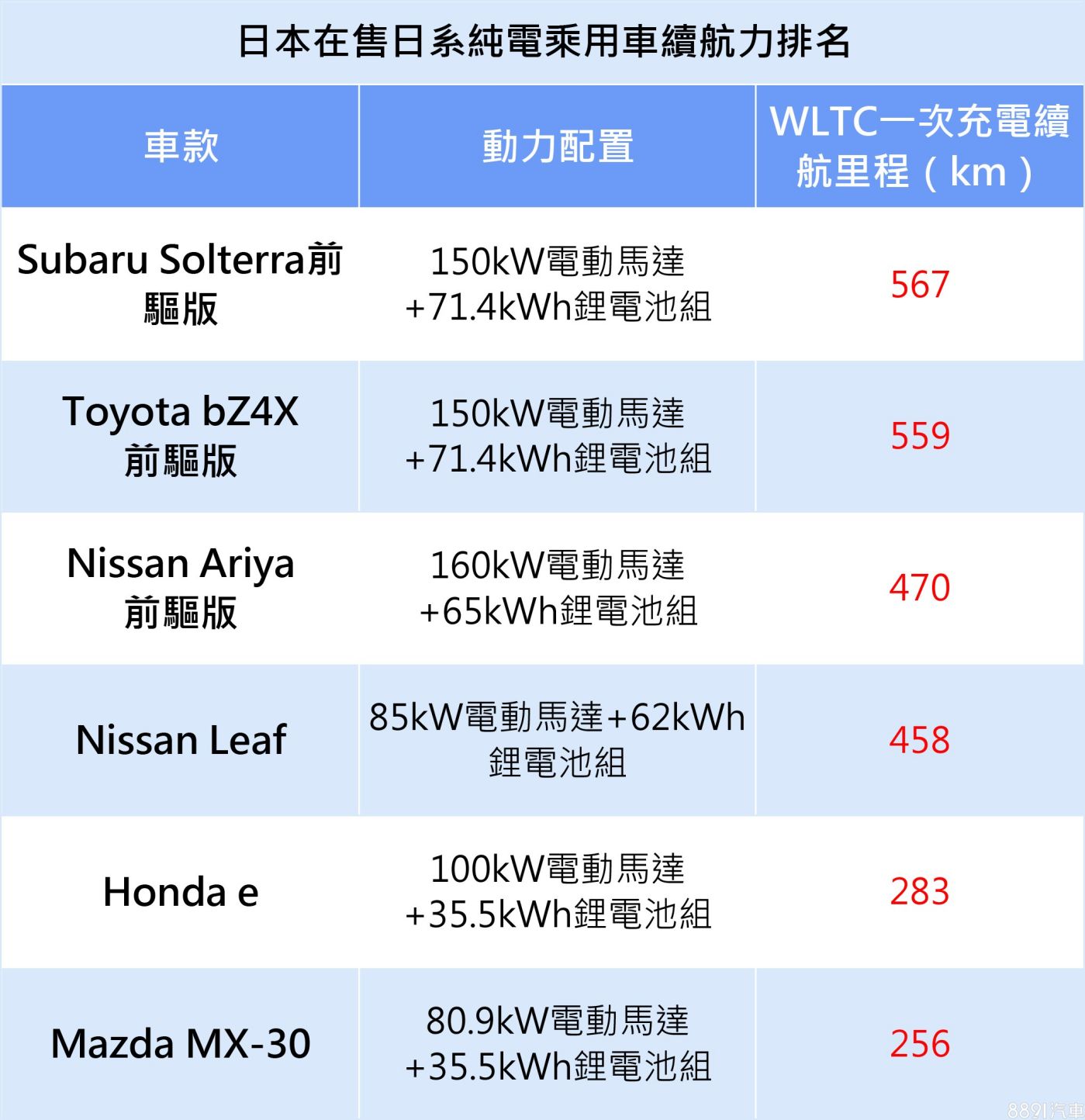 冠軍是甫於日本開賣的Subaru Solterra,雖說與「兄弟車」Toyota bZ4X動力採同樣配置,但其於WLTC標準測試下的一次充電續航里程,比bZ4X多出8km。