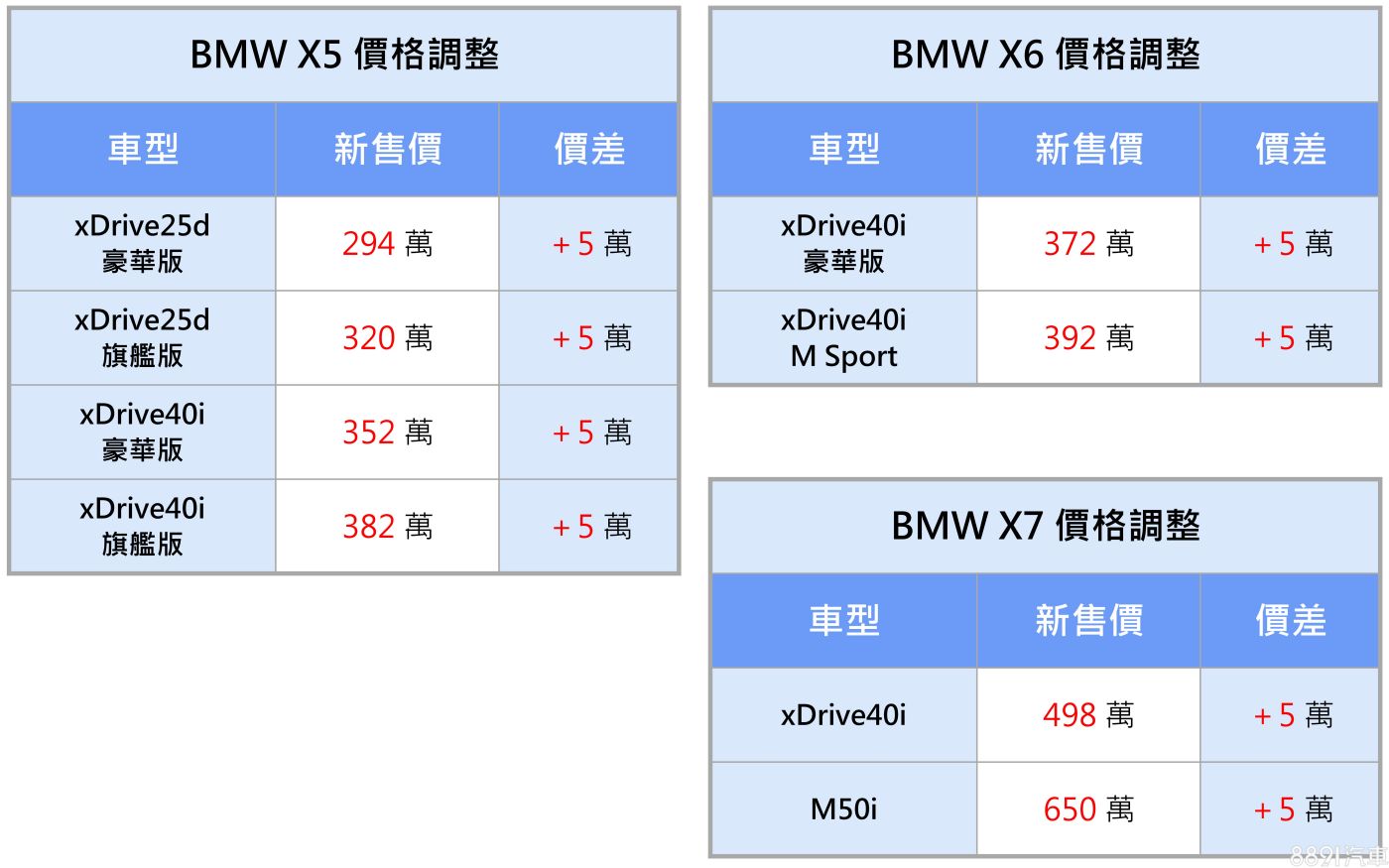 數款X休旅家族也名列此波調整中,包含X5、X6及X7皆順勢推出2022年式陣容,其中X5及X6皆不再供應M50i車型,其餘各車型則均隨年式更新調漲5萬。