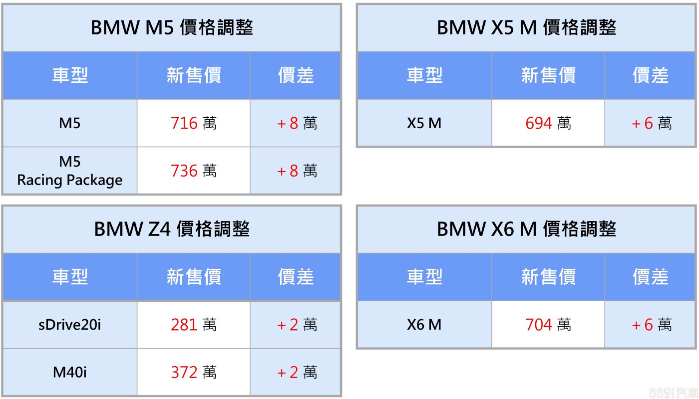 而M系列車款的價格調整,除了上述M3及M4外,M5各車型均漲價8萬元,至於X5 M及X6 M如今則必須多花6萬元才能入主。最後可別忘了Z4,推出2022新年式的同時,價格也隨之增長2萬元,並維持20i及M40i兩車型編成。