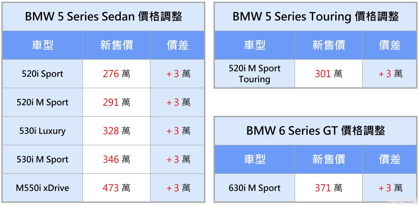 同樣地,大一號的5系列房車、旅行車和所衍伸的斜背款6系列Gran Turismo,也同樣在既有編成下,迎來3萬元漲幅,而這波漲價也順勢讓520i Touring加盟為「300萬俱樂部」的一員!