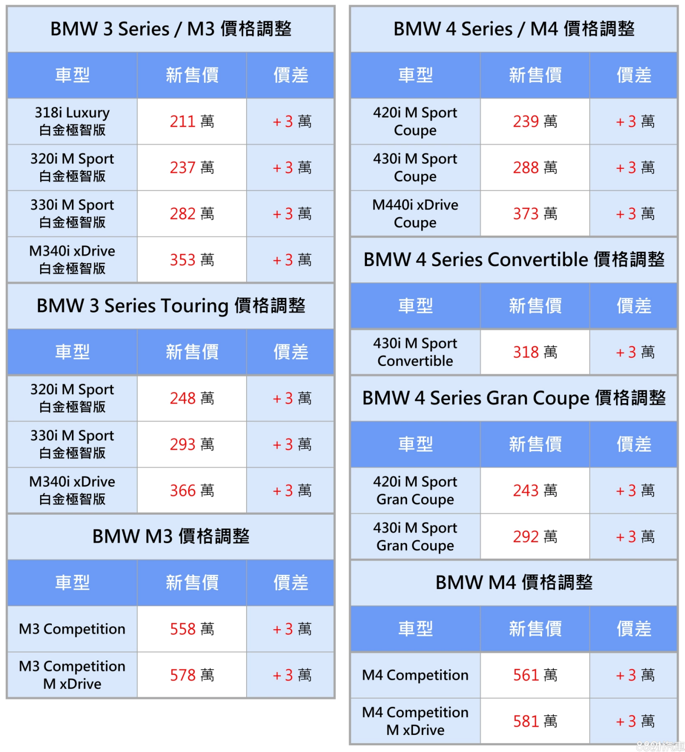 品牌熱門的3系列及4系列各式車型,全車系皆調漲3萬元,這也讓3系列入門定位的「318i」售價,突破以往所未見過的210萬門檻!順帶一提,高性能版的M3及M4也同步漲價3萬。