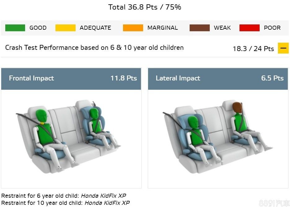 後座兒童防護是主要扣分項目之一,雖說正面偏位撞擊時,模擬10歲兒童的假人數據顯示,基本保護有一定水準,但從影片中分析,安全帶有從肩上滑落的風險,可能導致身體固定不確實而加重碰撞的傷害。