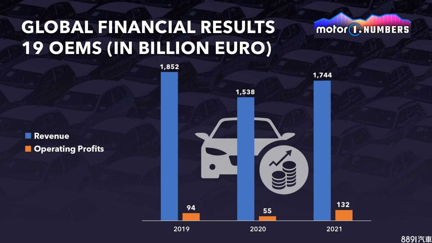 從上圖來看,這19家車企2021年營收加總已高於前年,尚未回到疫情爆發前的水準(2019年),不過更令人好奇的是,這些企業2021年共售出6954萬輛新車,相比2019年衰退了14%,但營業利潤卻是不減反增。