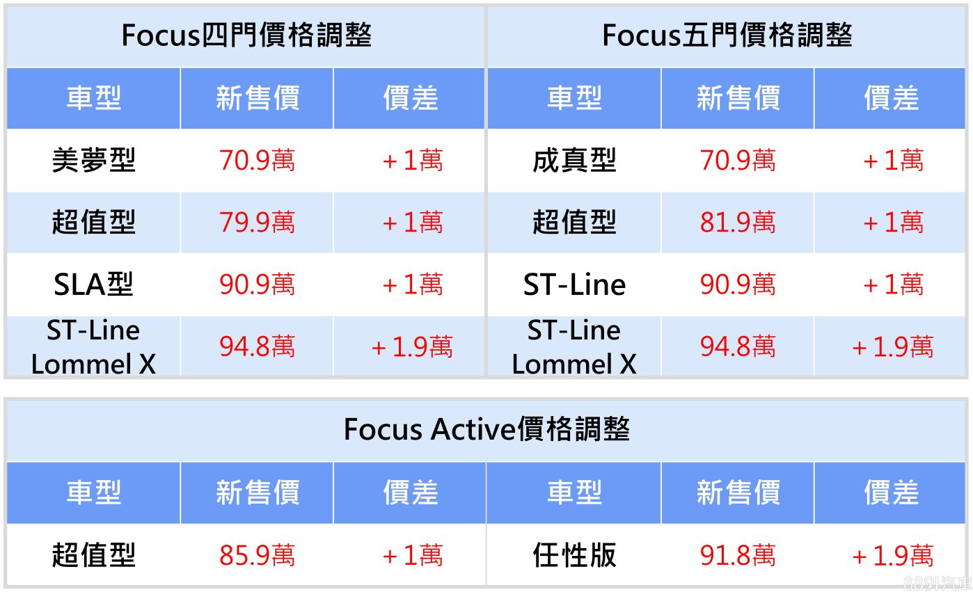 Focus包含四門款、五門款及Active跨界車型在內,也同樣發布22.5年式陣容。三車系日前已先行為頂規款調漲1.9萬,如今其餘各車型也跟進年式更新,編成配備未調整,不過價格同Kuga全部漲價1萬。