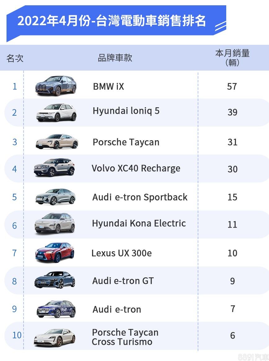 本月電動車銷售排行榜多了許多新面孔,包含BMW iX、Hyundai Ioniq 5都是首度上榜,主因不外乎就是新車到港開始交車。