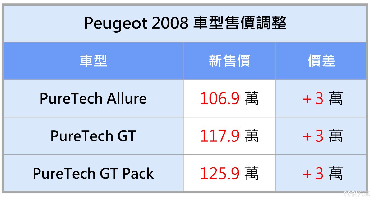 其中,2008小跨界全面調漲3萬元,價格帶來到106.9~125.9萬。3008常態販售車型則不分版本,皆迎來4萬漲幅。