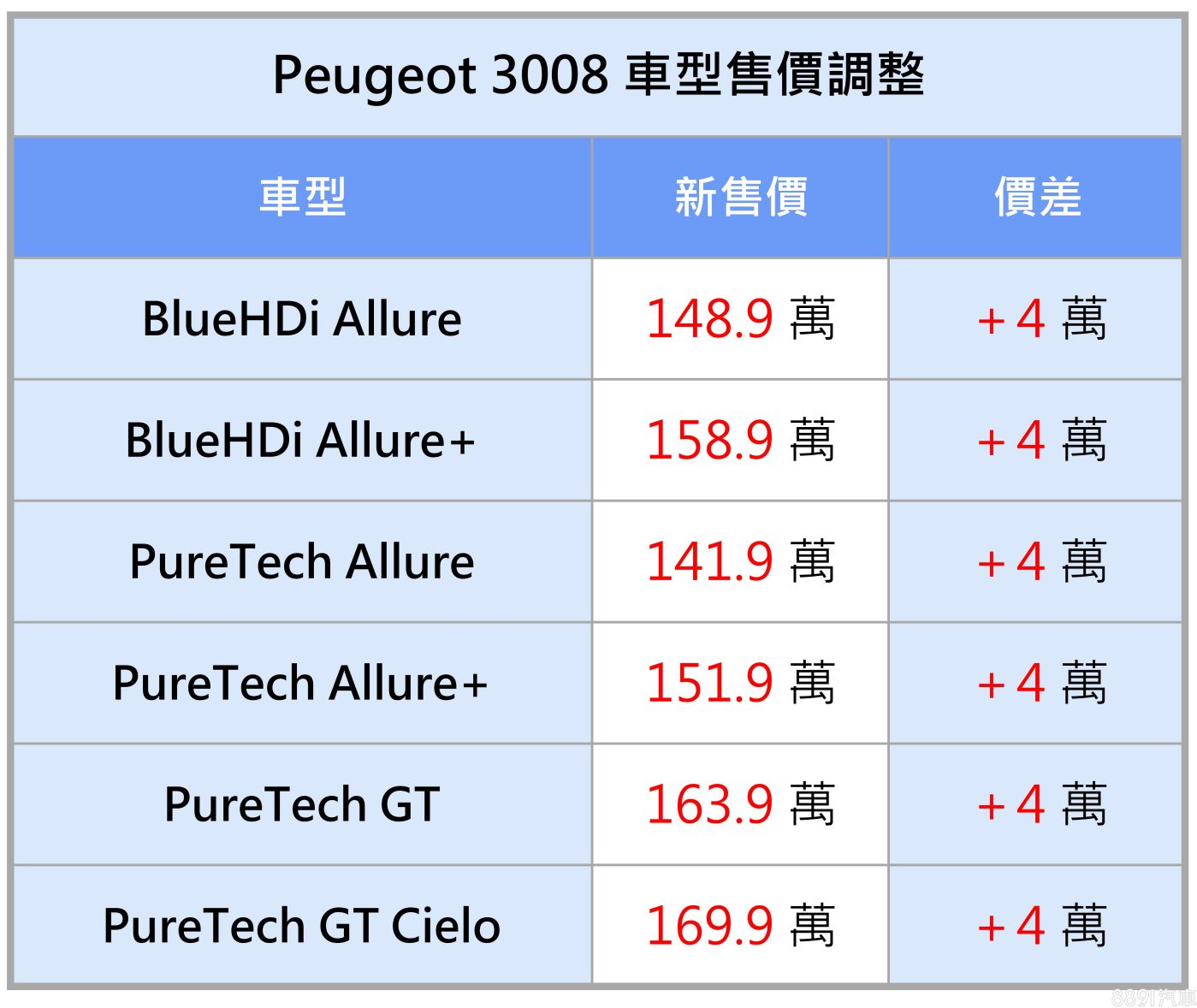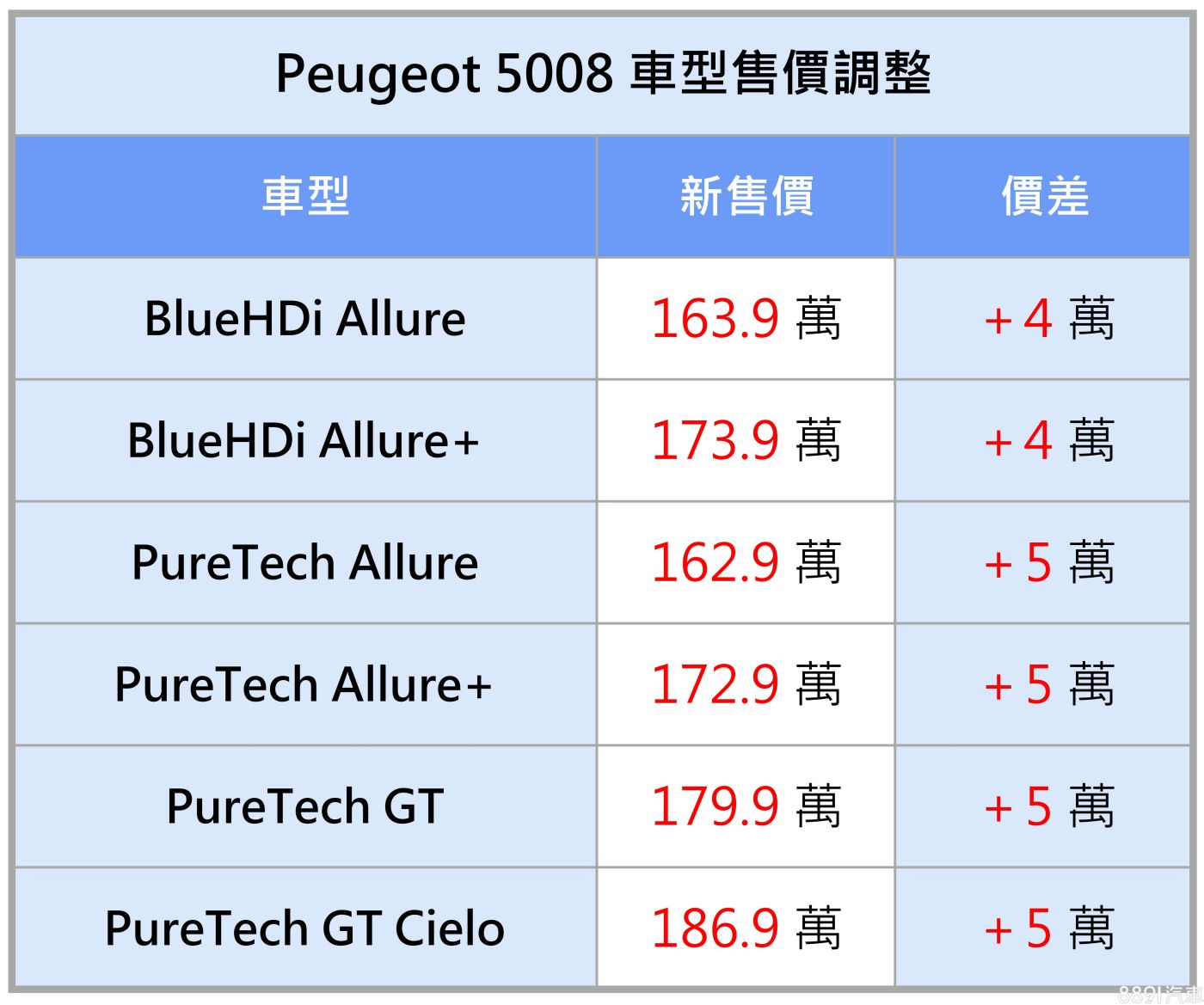 尺碼更大的5008,同樣針對常態販售車型調漲,BlueHDi柴油款同樣漲價4萬元,至於PureTech汽油款則有著5萬漲幅。